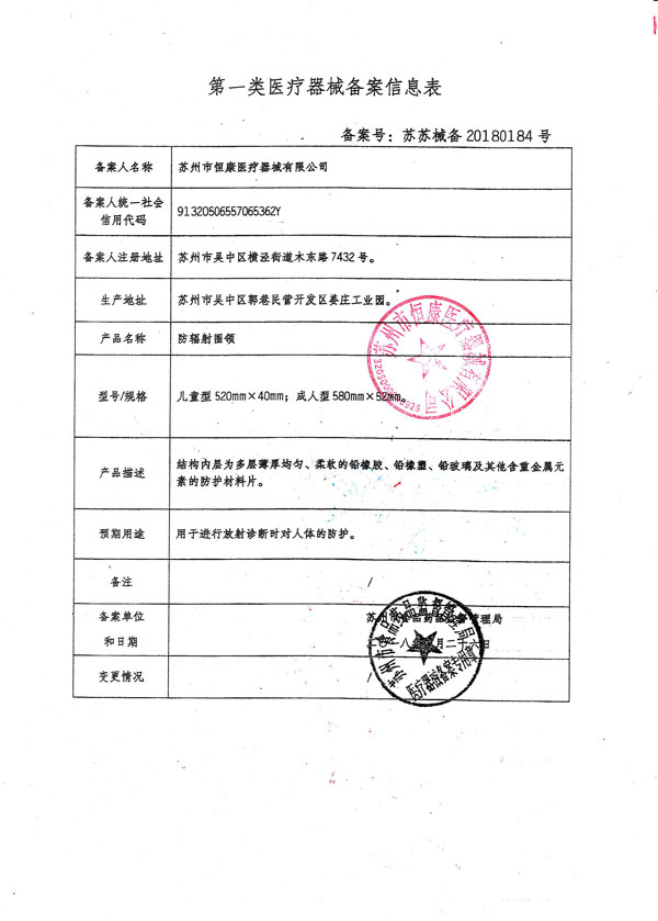 防輻射圍領(lǐng)第一類醫(yī)療器械備案